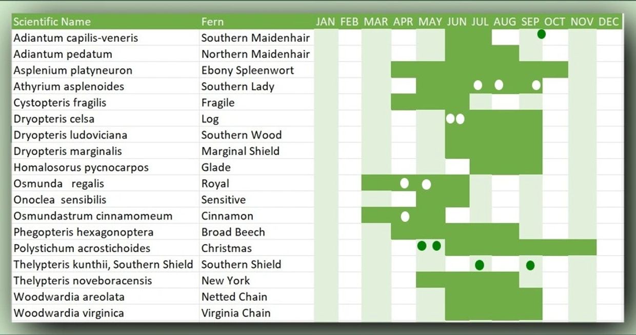The dots are when mature spore were harvested and cultured from ferns at the NC Botanical Garden.